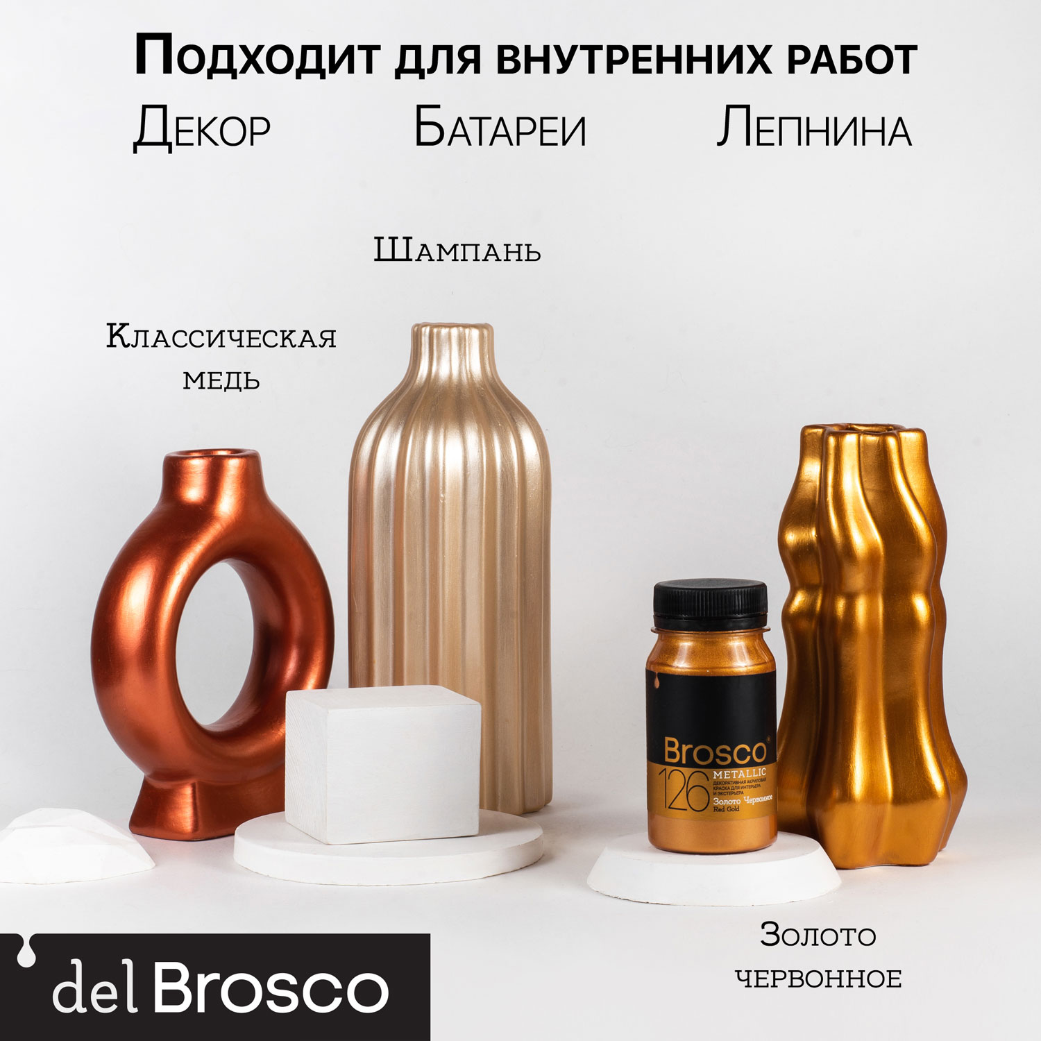 Акриловая краска с металлическим эффектом del Brosco Metallic идеально подходит для любых интерьерных и экстерьерных работ. Она с лёгкостью преобразит внешний вид вашей мебели, дверей, кухонного гарнитура, стен и различных декоративных предметов интерьера: зеркал, рам, ваз, кашпо, подсвечников, люстр, багетов и т.д. В экстерьере могут использоваться для декора орнаментов на зданиях, элементов ворот, заборов, ограждений, козырьков, навесов, пиков, завитков, а также садовых фонарей, скульптур и прочих украшений в ландшафтном дизайне.