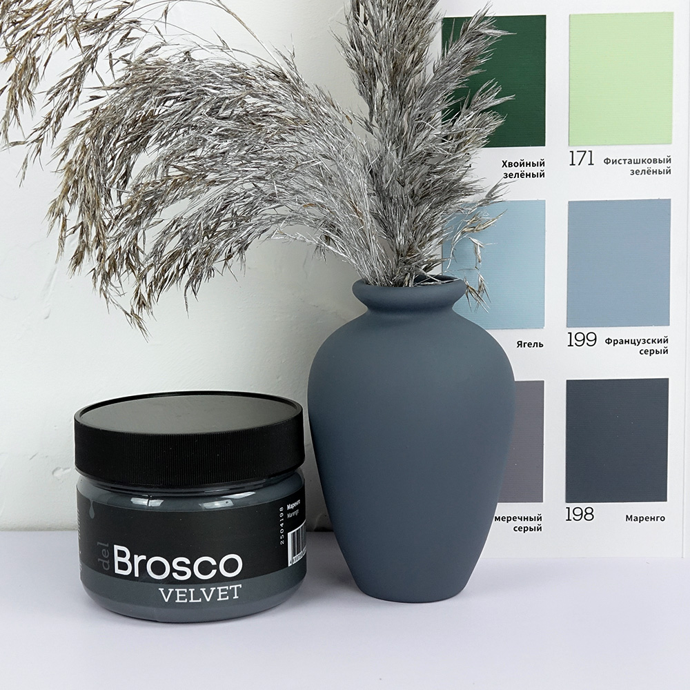 Ультраматовая акриловая краска del Brosco Velvet идеально подходит для любых интерьерных работ. Она с лёгкостью преобразит внешний вид вашей мебели, дверей, кухонного гарнитура, стен и различных декоративных предметов интерьера. Краска del Brosco обладает потрясающей текучей консистенцией, она легко разносится по поверхности кистью или валиком. Большинство цветов перекрывает подложку с одного слоя, но для наиболее равномерного покрытия рекомендуем наносить 2-3 тонких слоя, а не один плотный.