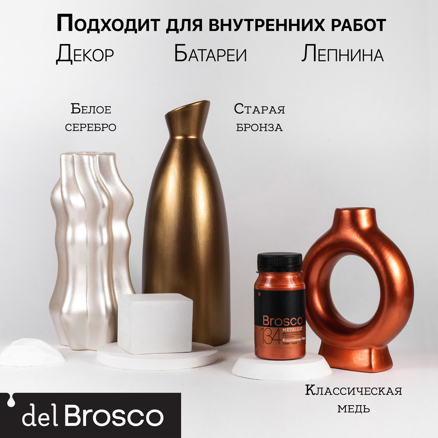 Акриловая краска с металлическим эффектом del Brosco Metallic идеально подходит для любых интерьерных и экстерьерных работ. Она с лёгкостью преобразит внешний вид вашей мебели, дверей, кухонного гарнитура, стен и различных декоративных предметов интерьера: зеркал, рам, ваз, кашпо, подсвечников, люстр, багетов и т.д. В экстерьере могут использоваться для декора орнаментов на зданиях, элементов ворот, заборов, ограждений, козырьков, навесов, пиков, завитков, а также садовых фонарей, скульптур и прочих украшений в ландшафтном дизайне.