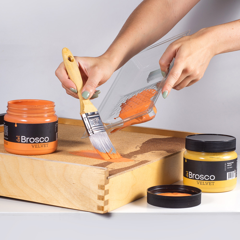 Ультраматовая акриловая краска del Brosco Velvet идеально подходит для любых интерьерных работ. Она с лёгкостью преобразит внешний вид вашей мебели, дверей, кухонного гарнитура, стен и различных декоративных предметов интерьера. Краска del Brosco обладает потрясающей текучей консистенцией, она легко разносится по поверхности кистью или валиком. Большинство цветов перекрывает подложку с одного слоя, но для наиболее равномерного покрытия рекомендуем наносить 2-3 тонких слоя, а не один плотный.